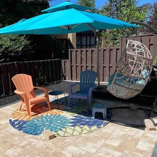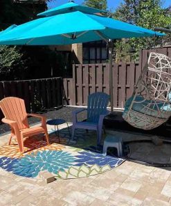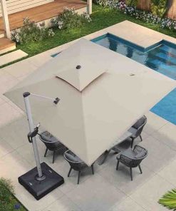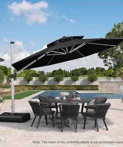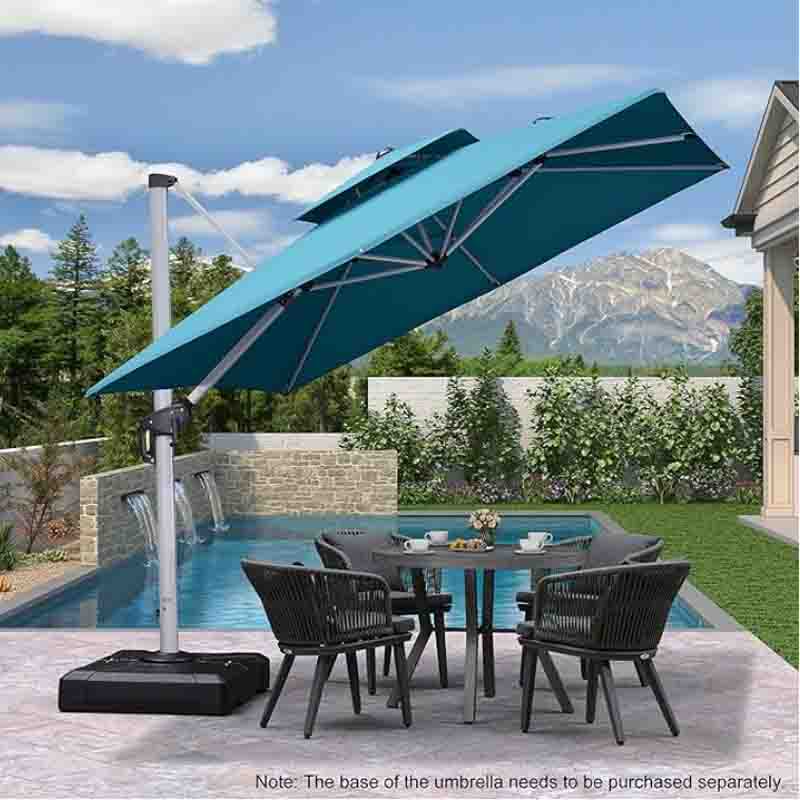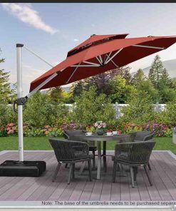 This: The umbrella size of the patio umbrella is 9′ X 9′, with a unique double-top umbrella design.Applicable: Commercial and residential use, this patio umbrella has a unique handle design and crank system,